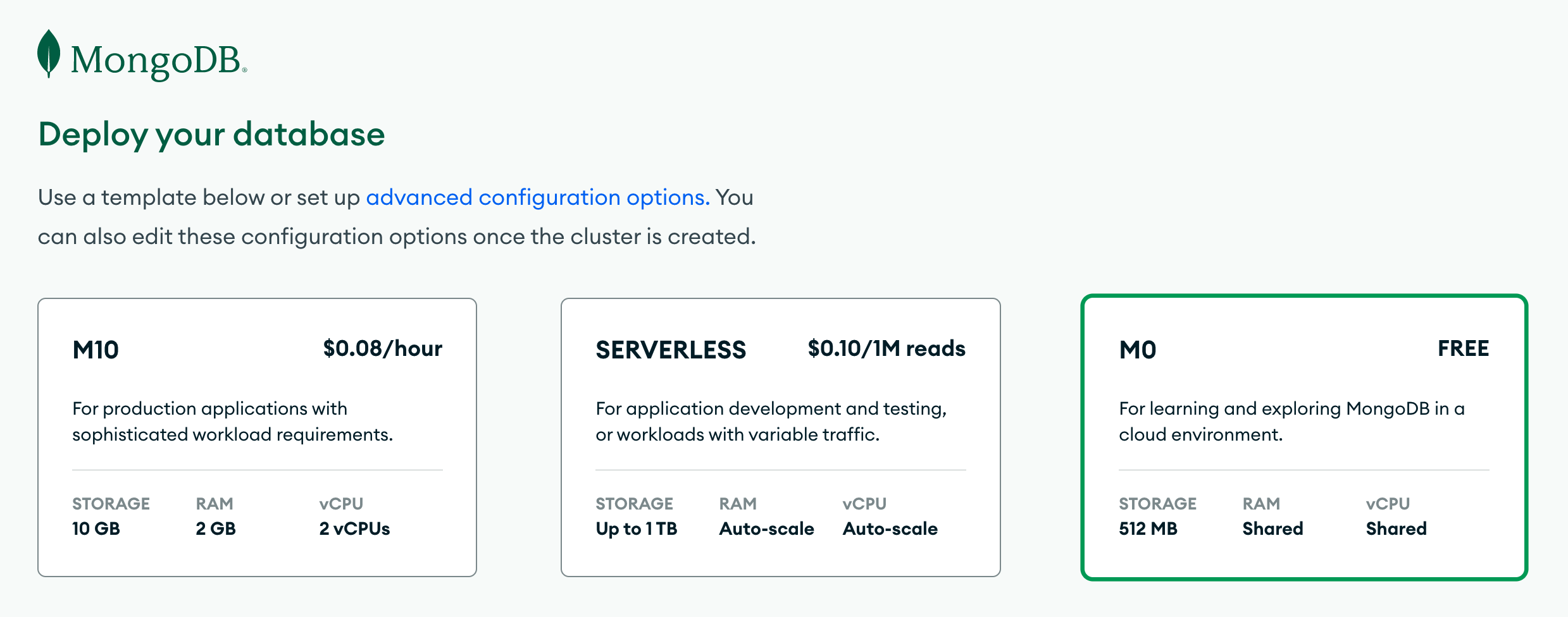 Signing up for MongoDB Atlas is completely free and doesn't require a credit card. Use the link below to create your account: